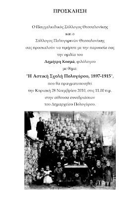 Ομιλία με θέμα "Η Αστική Σχολή Πολυγύρου, 1897-1915" θα πραγματοποιηθεί την Κυριακή 28 Νοεμβρίου, στις 11.00 π.μ., στην αίθουσα συνεδριάσεων του Δημαρχείου Πολυγύρου. Η εκδήλωση οργανώνεται από τον Παγχαλκιδικό Σύλλογο Θεσσαλονίκης και το Σύλλογο Πολυγυρινών Θεσσαλονίκης "Ο Τσουκαλάς". Ομιλητής θα είναι ο φιλόλογος, Δημήτρης Κοσμάς.